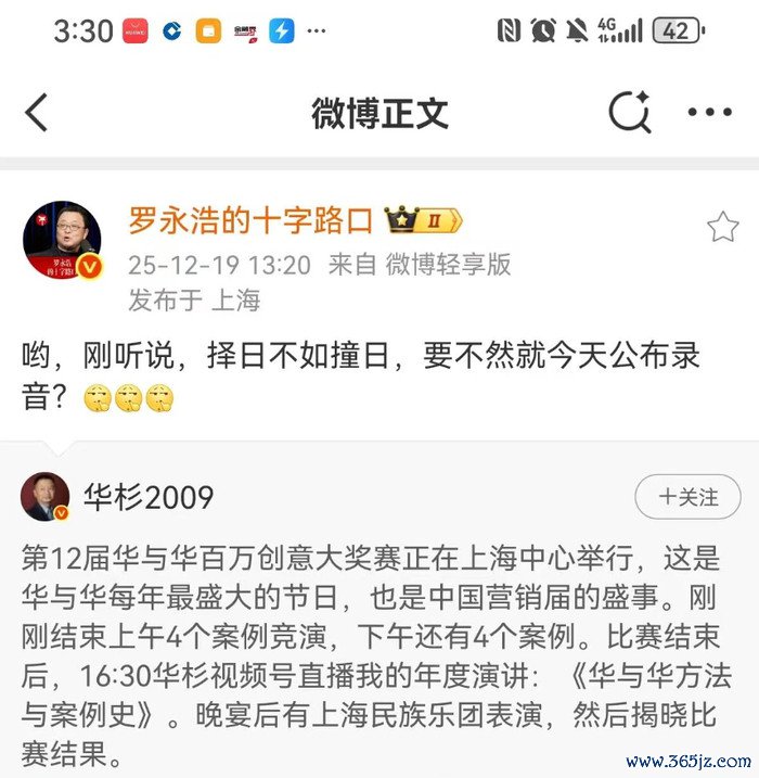 12月19日,中国营销界的盛事——第12届华与华百万创意大奖赛正在上海中心火热举行。罗永浩径直转发华杉的赛事动态隔空喊话:“哟,刚据说,择日不如撞日,要否则就今天公布灌音?”这一遽然“逼宫”,让原来聚焦赛事的网友遽然将防备力转向这场跨界纠葛。